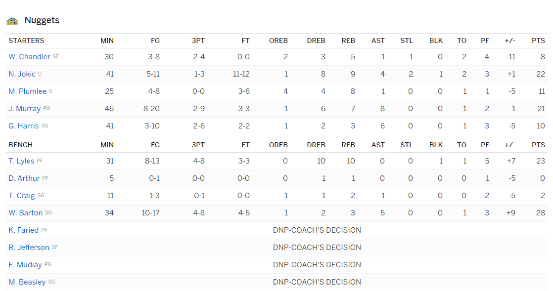 Repasemos la última rotación de Malone. Ayer mismo ante Minnesota; prórroga incluida. Sólo ocho jugadores: Jamal Murray, Gary Harris, Wilson Chandler, Nikola Jokic y Mason Plumlee de titulares; Will Barton, Trey Lyles y Torrey Craig como única aportación desde el banquillo —y contribución de Darrell Arthur testimonial—.