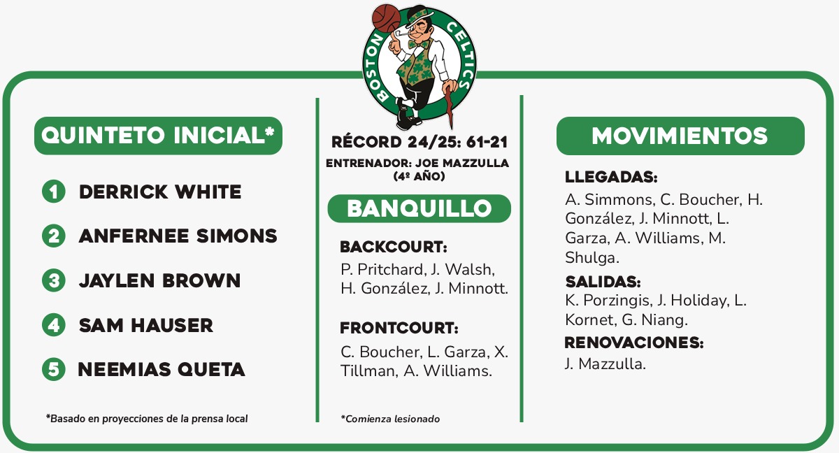 Es el turno de publicar la previa NBA 2025-26 de los Boston Celtics. Datos, resultados de la temporada anterior, un vistazo a su plantilla y a sus futuros agentes libres, los objetivos del curso, el jugador a seguir y un pronóstico sobre la franquicia.