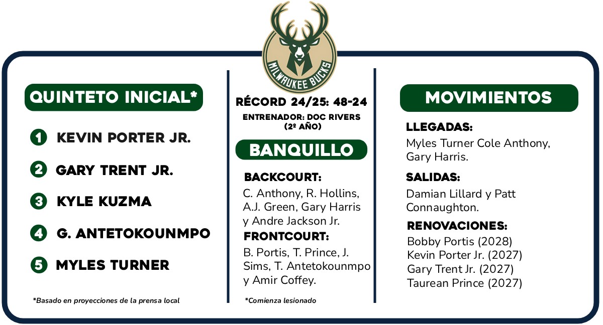 Empezamos las previas NBA 2025-26 con los Milwaukee Bucks. Datos, resultados de la temporada anterior, un vistazo a su plantilla y a sus futuros agentes libres, los objetivos del curso, el jugador a seguir y un pronóstico sobre la franquicia.