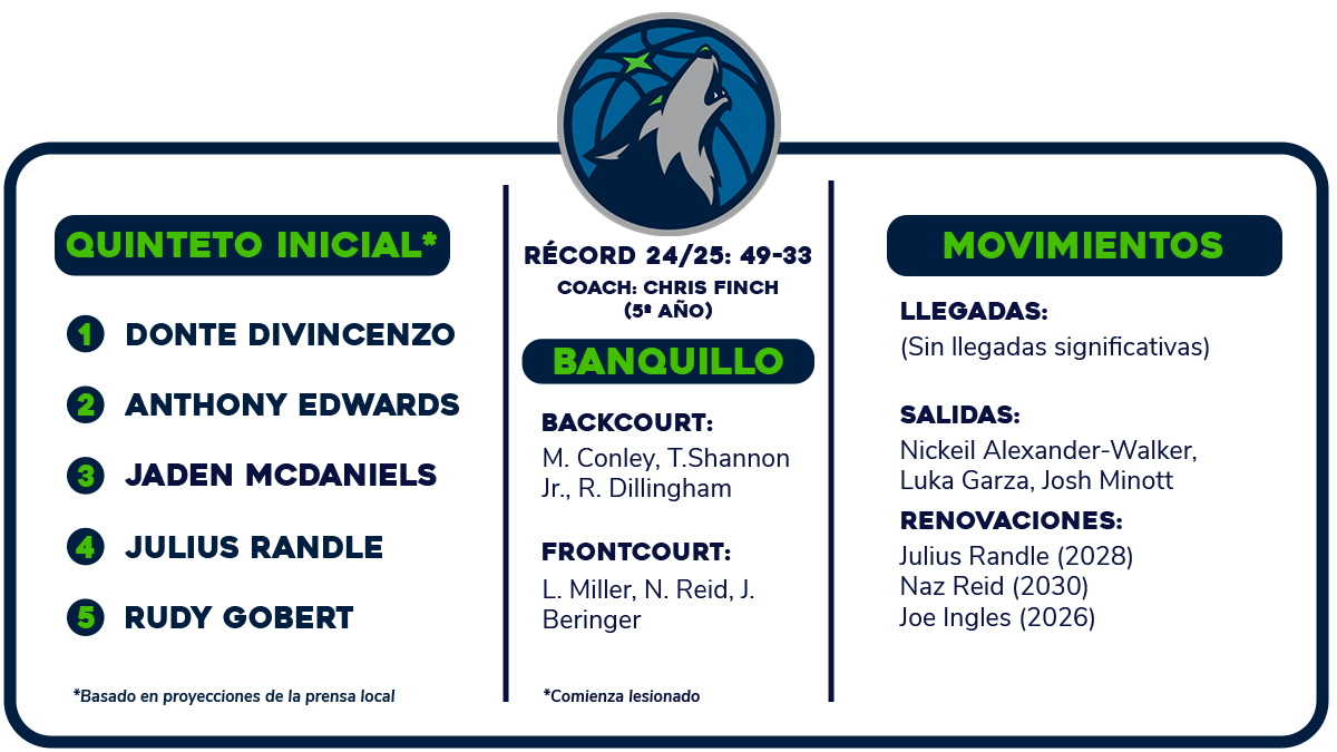 Es el turno de publicar la previa NBA 2025-26 de los Minnesota Timberwolves. Datos, resultados de la temporada anterior, un vistazo a su plantilla y a sus futuros agentes libres, los objetivos del curso, el jugador a seguir y un pronóstico sobre la franquicia.