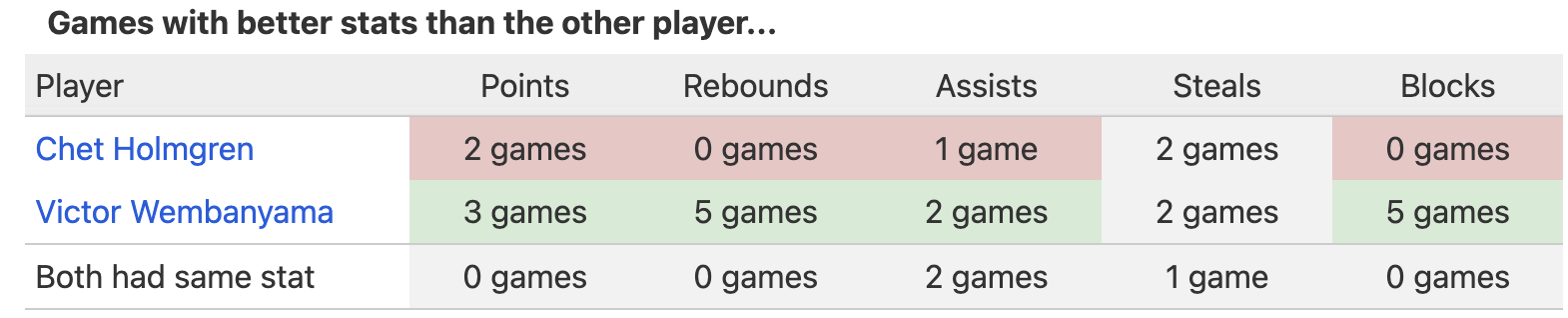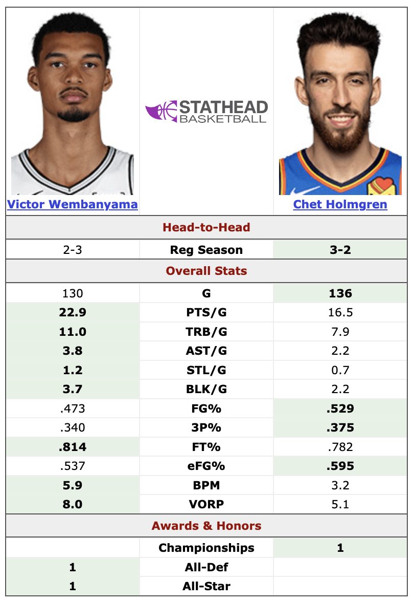 El StatHead entre Wembanyama y Holmgren se resume por ahora en un 3 a 2 a favor del segundo, claramente beneficiado por jugar en un mejor equipo, pero donde el primero –como ya sucediera hace cuatro años en la Final del sub-19– acumula siempre mejores registros personales.