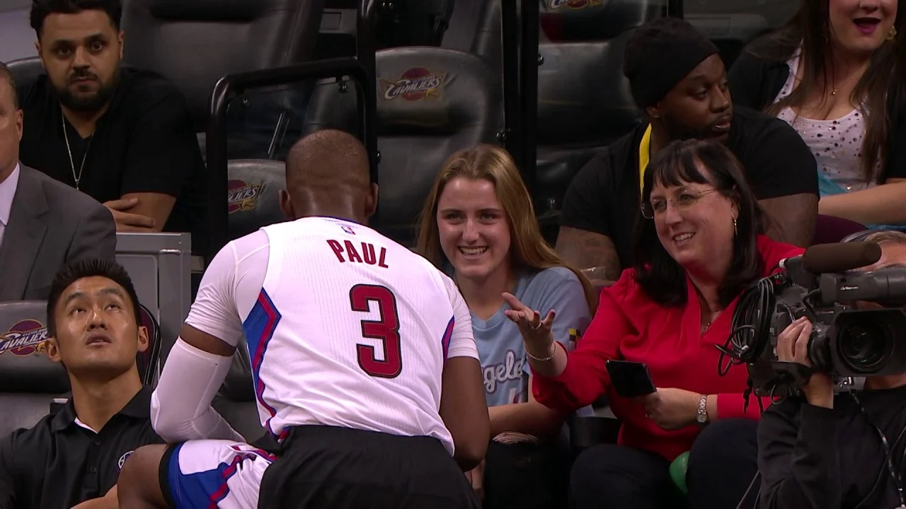 El base de Los Angeles Clippers, Chris Paul, posó para un selfie con una aficionada durante el partido de los Clippers ante los Cavaliers. Paul no estaba disputando el encuentro en ese momento, sino que estaba viendo el partido sentado en la línea de fondo.