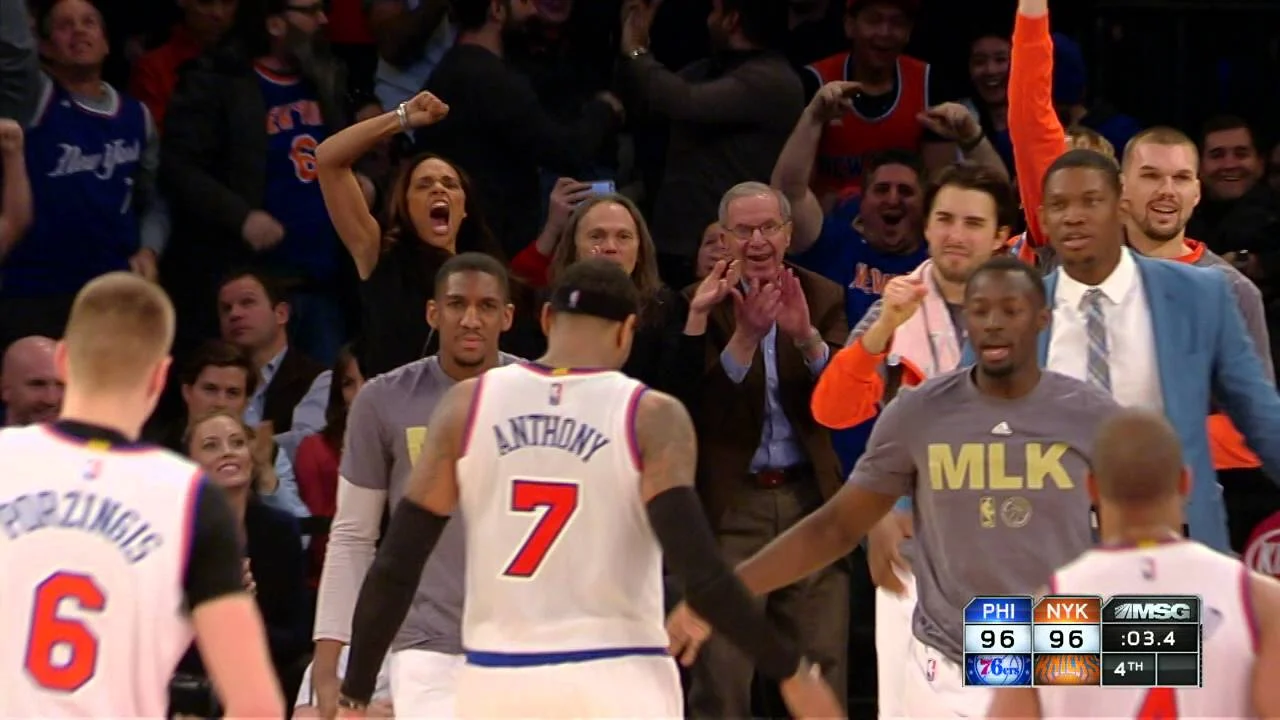 Pese a su gris jornada en el lanzamiento (7/28), tuvo que ser la estrella de los Knicks quién forzó la prórroga al anotar un triple inverosímil cuando apenas restaban tres segundos (96-96).